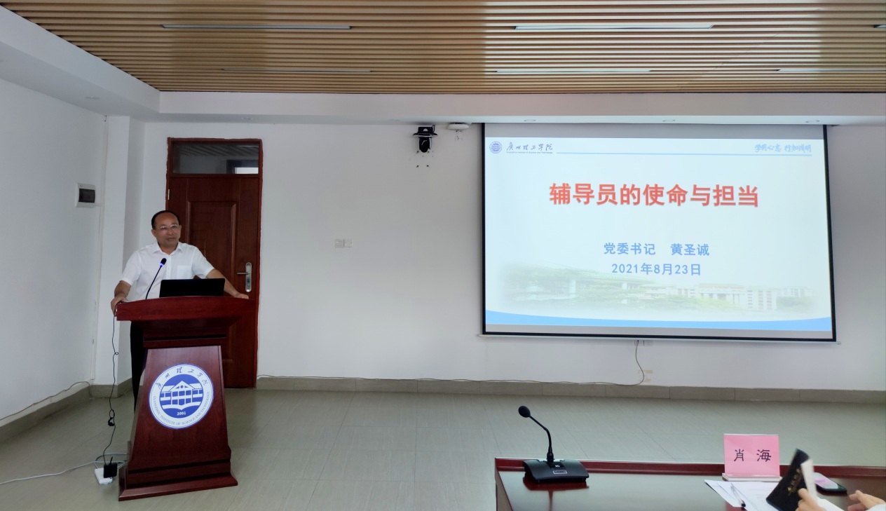 党委书记黄圣诚为本期培训班的开班作了动员报告,同时作了《辅导员的使命与担当》专题辅导报告。他告诫每一位辅导员:肩上的担子是沉甸甸的,要坚持落实“立德树人”根本任务,全员全过程全方位育人,辅导员既是联络员,又是指挥员和战斗员。要正确引导学生认识世界、全面了解国情、把握时代大势,提高分析问题、明辨是非和价值判断能力;引导学生矢志不渝听党话、跟党走,把个人理想与国家发展、民族命运结合起来,争做社会主义合格建设者和可靠接班人。他对新入职辅导员提出了六点要求:一是要用习近平新时代中国特色社会主义思想武装头脑,铸魂育人;二是要时刻绷紧意识形态工作这根弦;三是要敬业爱生;四是要矢志不渝;五是要终身学习;六是要讲究工作方式方法。