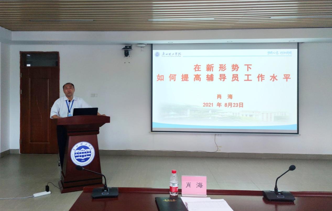 副校长肖海作了《在新形势下如何提高辅导员工作水平》的专题报告。他首先明确了辅导员的定位是:辅导员是开展大学生思想政治教育的骨干力量,是高等学校学生日常思想政治教育和管理工作的组织者、实施者、指导者。辅导员应当努力成为学生成长成才的人生导师和健康生活的知心朋友。他进一步谈到辅导员工作的基本目标、基本理念、基本思路、基本原则、基本方法。强调一切为了学生,一切依靠学生,从学生中来,到学生中去,把学校的正确主张变成学生的自觉行动,好事要办好,学生满意才是硬道理:正所谓“金杯、银杯,不如学生的口碑”。